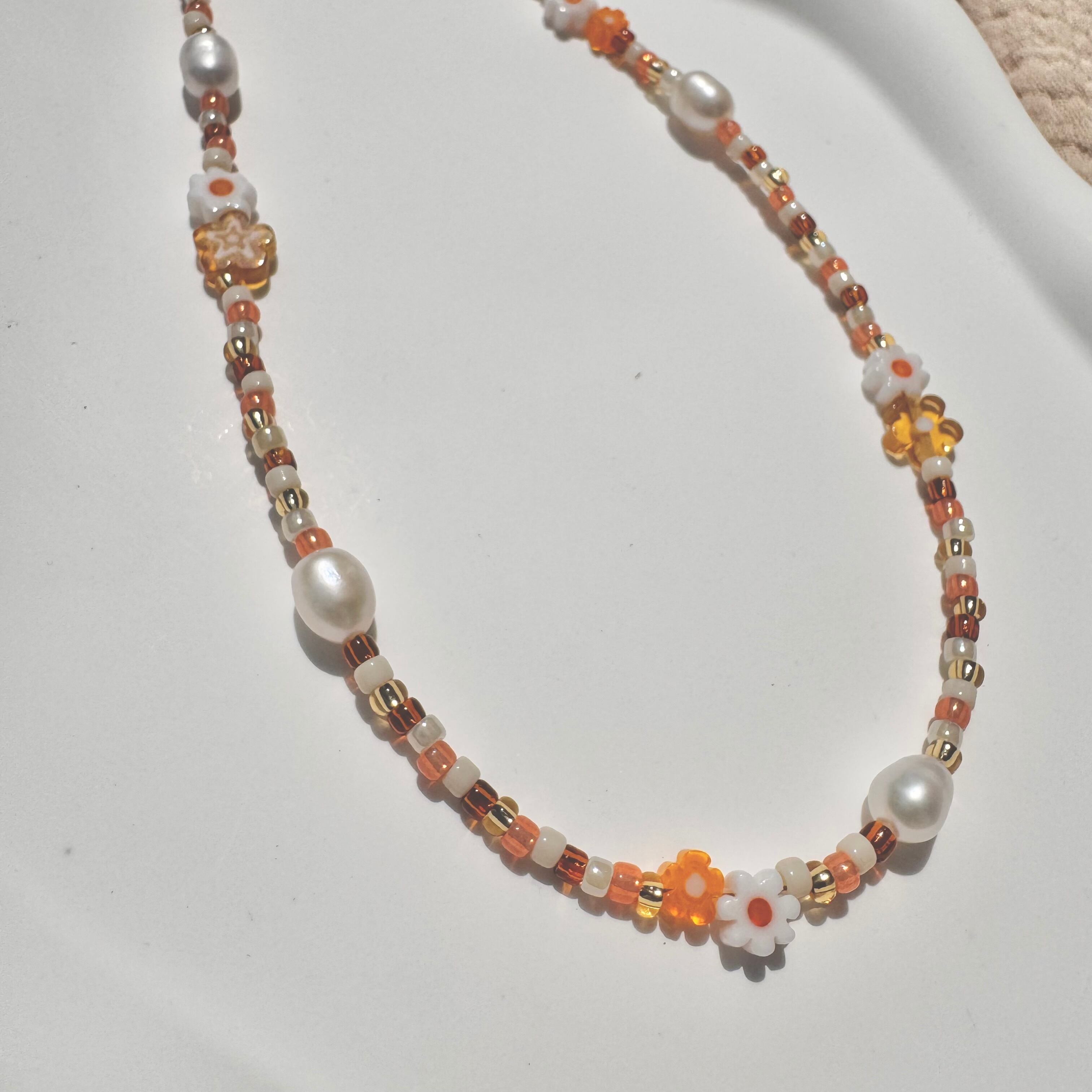 オレンジ色のビーズとお花のネックレス❁❁❁