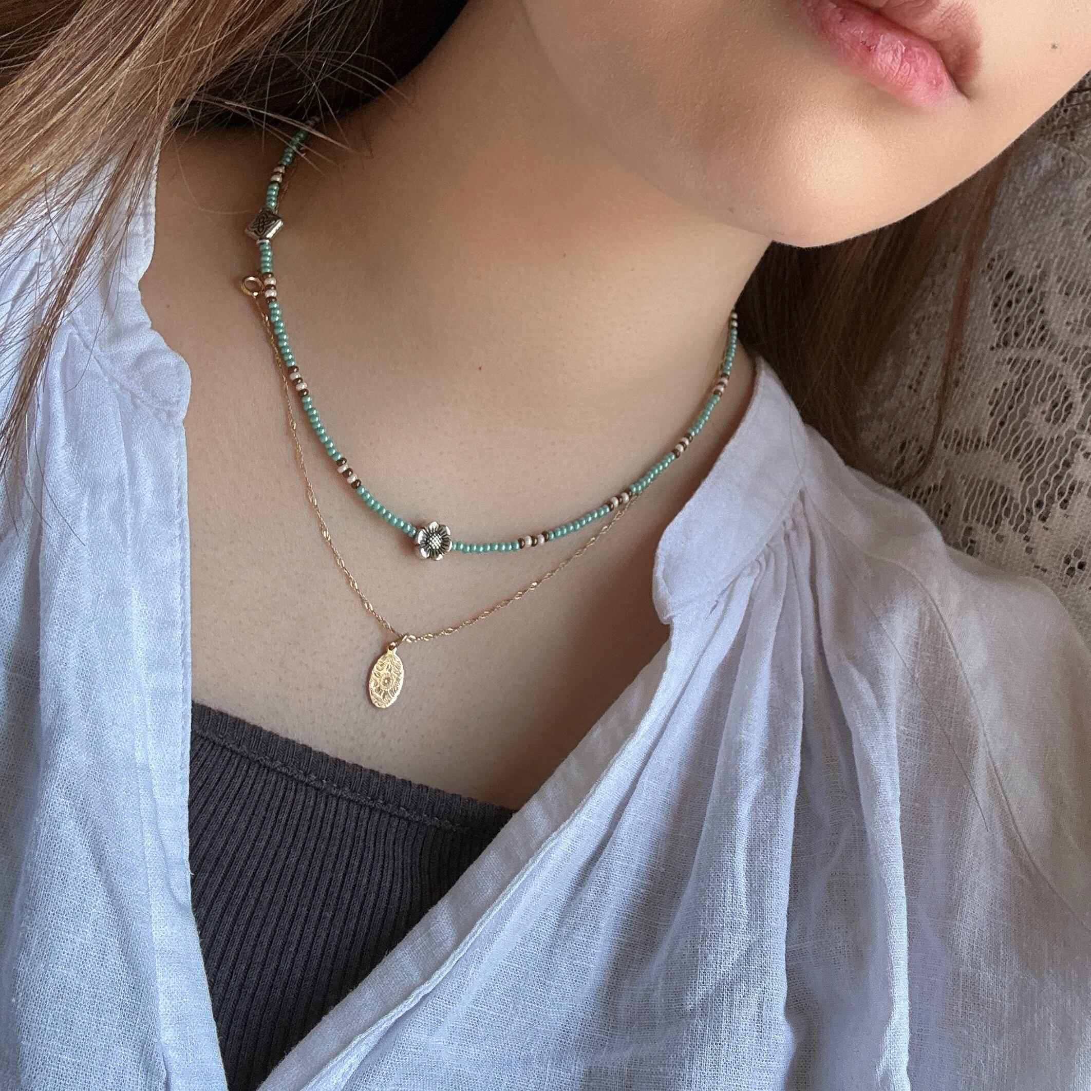 インディアンジュエリーをイメージして配色したデザインとフラワービーズの組み合わせが可愛いネックレスです☀︎︎☽