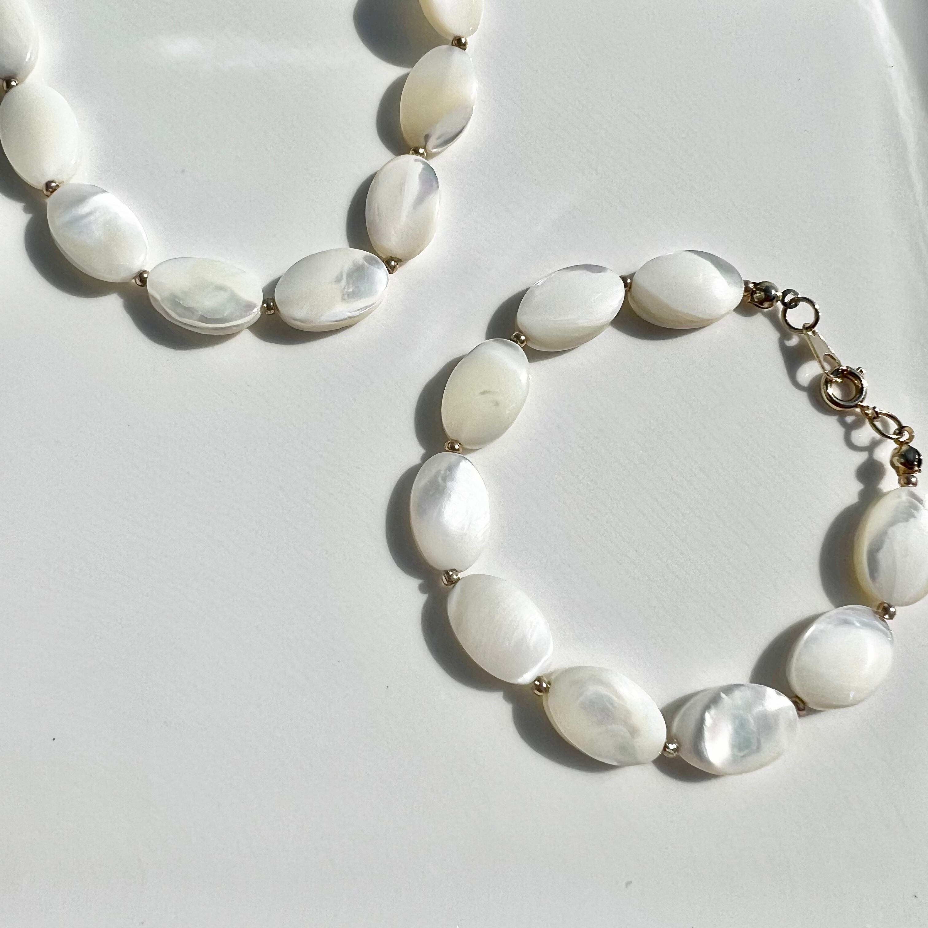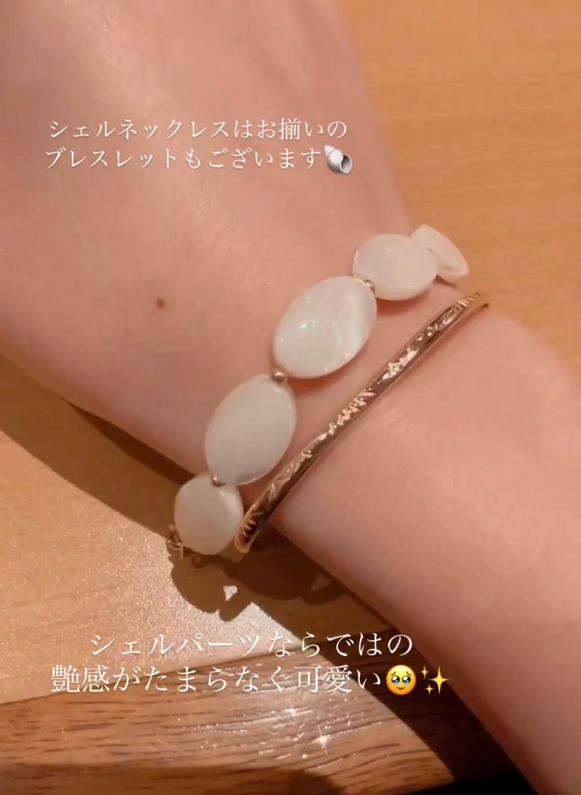 光によって輝き方が変わるシェルはシンプルだけれども、存在感のあるブレスレットです☺️✨