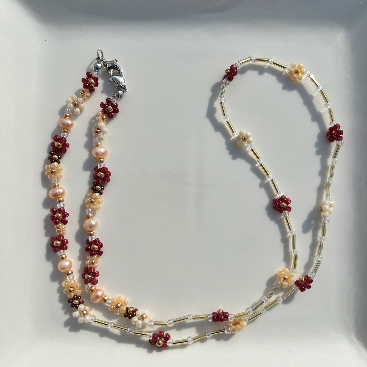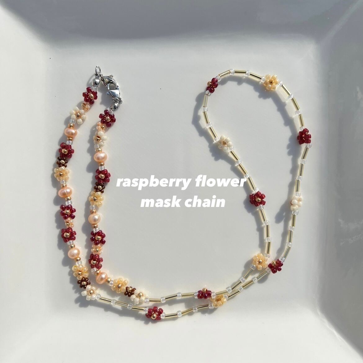 ラズベリーカラーのお花とホワイトの淡水パールを使用した可愛いマスクチェーン✨